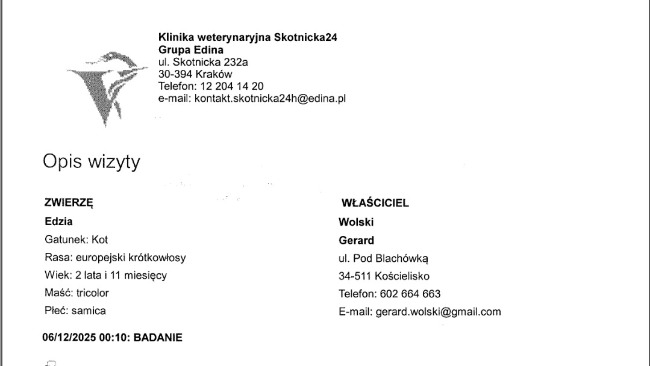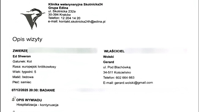 Niestety kotek Ed Sheeran odszedł w klinice. Poniżej dołączam jego kartotekę i rozliczenie jego pobytu w klinice.