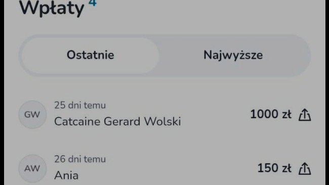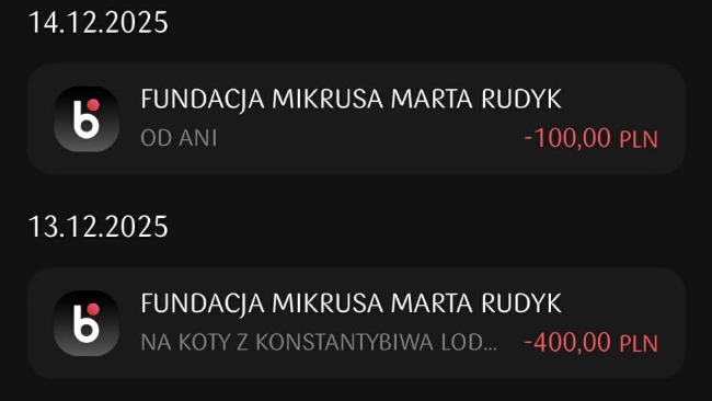 Że zbiórki zostało wpłacone 1000zł na pomoc naszym kotkom które były w Azylu Mikrusa. Oraz zostało do nich wysłane jeszcze 400zł blikiem (potwierdzenie dorzucę jak je dostane)