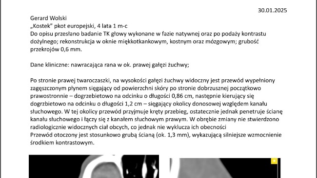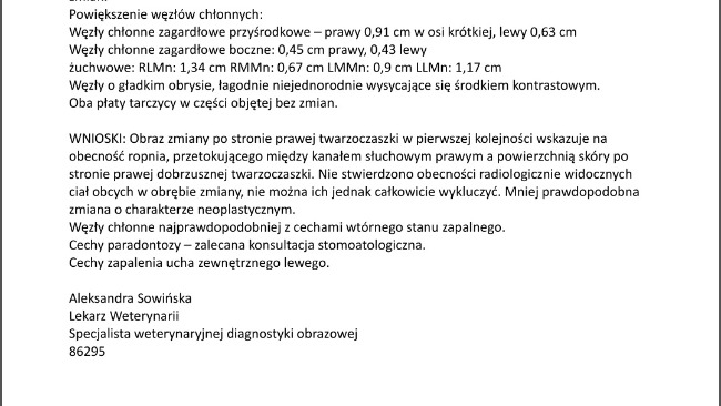Czekamy na opis tomografii, ale po zdjęciach widać, że coś tam jest. Podejrzenie jest ze to jakiś ząb pozostałość po jakiejś walce jak żył jeszcze na wolności. Tu też czeka nas przygotowanie i zabieg usunięcia ciała obcego.