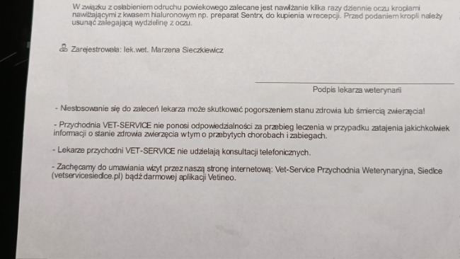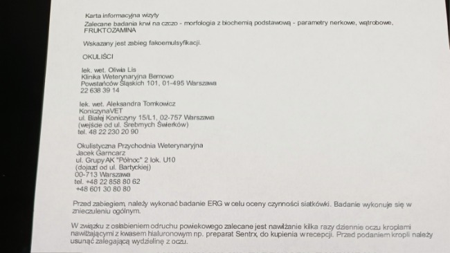 Załączam dokumenty z pierwszej wizyty u psiego okulisty, musimy Puszkowi zakraplać oczy specjalnymi kroplami, żeby gałka oczna nie była sucha. Ponieważ przez zaćmę ma osłabiony ruch powieki, regularnie musimy stosować krople które kosztują ponad 80 zł za niecałe 3 ml. A wiecie, jedna buteleczka to raptem 3 dni stosowania.