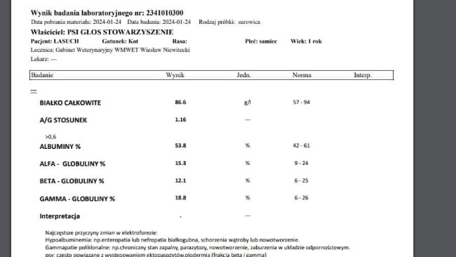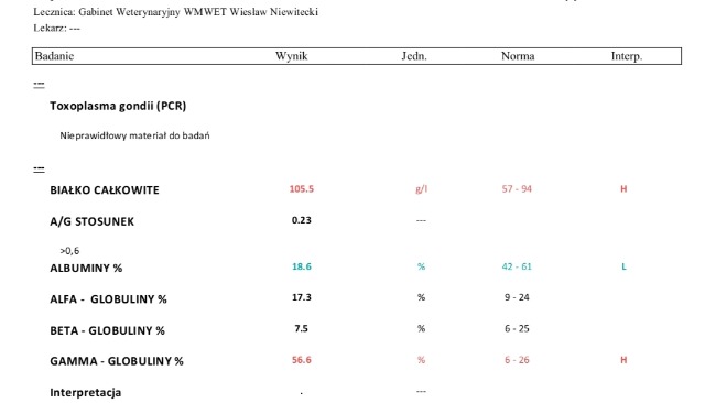 Dziś mija 22 dzień leczenia, widzimy duża poprawę. Zamglone oczy zaczynają dostrzegać kształty, zmieniły kolor z zielono niebieskich na normalny. Czeka nas jeszcze wizyta u okulisty.
