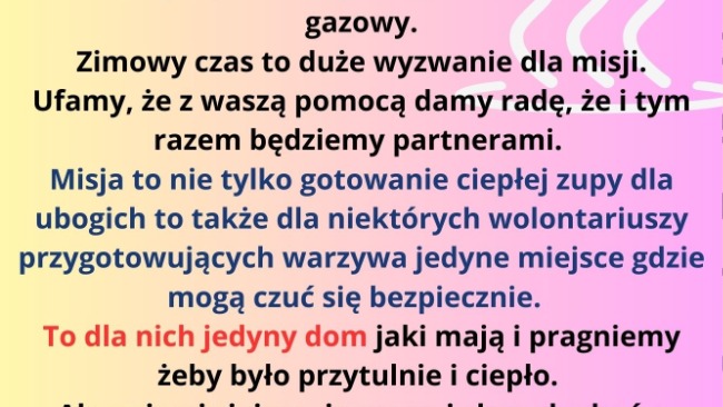 Jesteśmy Misją pomagającą ludziom w kryzysie. Można więcej dowiedzieć się o tym co robimy na FB: www.facebook.com/ BetezdaBydgoszcz/ Zbieramy na duży rachunek za gaz. Wierzymy, że skoro serca ludzi otwierają się na pomoc zwierzętom to tym bardziej na pomoc ubogim i bezdomnym. Nasza Misja od ponad 20 lat pomaga osobom w kryzysie. Finansujemy się tylko z datków od takich osób jak Państwo. Codziennie wydajemy około 100 litrów zupy. Na szczęście mamy z czego gotować ale rachunki trzeba płacić. Dlatego właśnie potrzebujemy Państwa wsparcia.