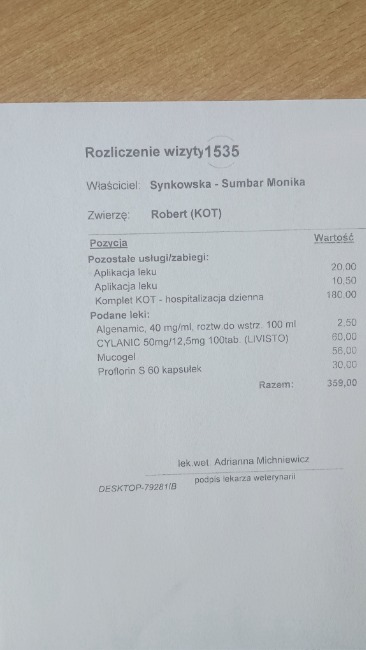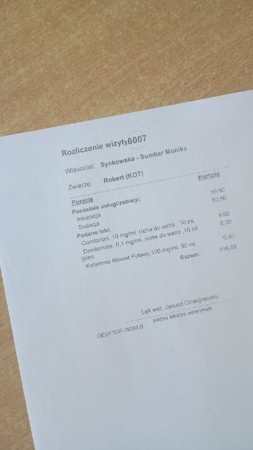 Na miejscu wykonano USG Fast, RTG, morfologię, podano zastrzyki. Kotek został poddany intubacji i sedacji. Użyte leki: Comfortan, Prewomax, Synulox, Dexdomitor, Algenamic, Proflorin, Cylanic, Mucogel.