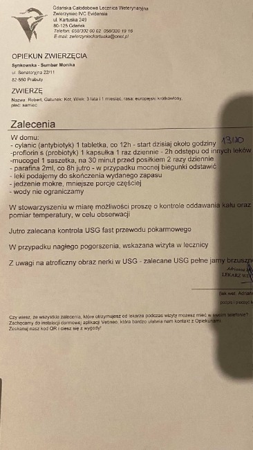 Sytuacja wymagała natychmiastowej interwencji weterynaryjnej. Niestety z racji weekendu, w naszym mieście oraz okolicy nie było dostępnej całodobowej pomocy. Byliśmy zmuszeni pilnie udać się do najbliższej czynnej kliniki weterynaryjnej w Trójmieście.