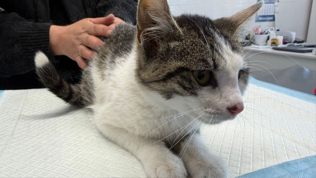 Przywiozła kocurka w bardzo złym stanie. Kocurek przybłąkał się do niej w ostatnich dniach, lecz sterczący kręgosłup i ogromny brzuch zaniepokoiły ją na tyle, aby zabrała go do weterynarza.