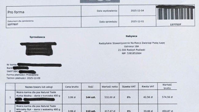 Czy musimy coś więcej pisać? To naprawdę są artykuły pierwszej potrzeby. Karmę po prostu musimy kupić - jak nie teraz, to w najbliższych dniach, ale jeśli nie skorzystamy z tej oferty, to na tą samą ilość będziemy musieli wydać znacznie więcej! To się kompletnie nie opłaca, dlatego PROSIMY, pomóżcie nam uzbierać pieniądze. Mamy naprawdę mało czasu.