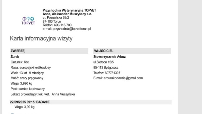 Ale przy przewlekłej niewydolności nerek nie wystarczy troska — potrzebne są częste badania krwi i moczu oraz wizyty u specjalistów. Przed nami kolejna kontrola — tym razem u nefrologa w Toruniu. Zanim jednak Żurek pojedzie na wizytę, musimy wykonać pełen pakiet badań diagnostycznych.