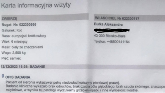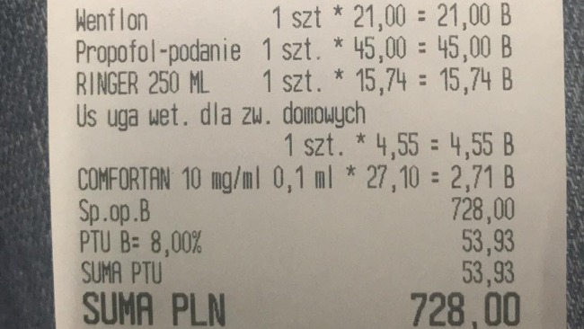 Rosną koszty weterynaryjne... Kilka dni temu na konsultacji swojej łapki był też Nugat... Koszt ponad 700 zł, a maluch codziennie ma także rehabilitacje. Również dołączamy paragon.