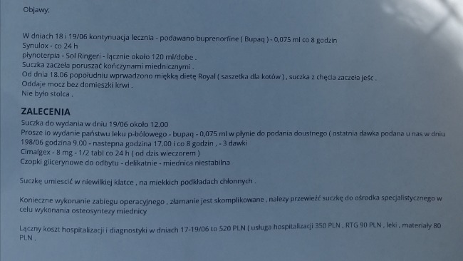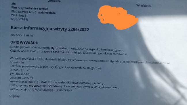 Witam. Jestem malutka Sisi. Do tej pory byłam bardzo energicznym psiakiem. Wszędzie mnie było pełno... Ciągle coś psocilam i byłam zawsze na pierwszym miejscu. Niestety zdarzył się wypadek. Kiedy wieczorem biegałam sobie wraz z moimi siostrami nadjeżdżał motor. Z ciekawości kto to pobiegłyśmy się przywitać... Moje siostry się tylko przyglądały a ja niestyty podbiegłam za blisko. Nie było już ucieczki.. Wpadła wprost pod koła motocyklisty....zatrzymal się i zobaczył ze leżę nieruchomo. Moj tatuś szybko wziął mnie na ręce i zawiózł do szpitala. Pozostałam tam przez 2 dni... Diagnoza straszna... Potrzaskana miednica... Okropnie mnie boli... Potrzebna jest pilna operacja ponieważ nie będę mogła już chodzić i odłamki kości mogą naruszyć narządy wewnętrzne...co może doprowadzić do mojej smierci. Moi rodzice chcą mi pomóc za wszelką cenę... Czuwają przy mnie dniami i nocami gdy ja płaczę tulą mnie do siebie. Jednak to nie wystarczy potrzebne są pieniądze żeby opłacić operacje. Po niesione koszty już to ok 600zl.sama operacja kosztuje ponad 3 tysiące a do tego jeszcze rehabilitacja. Bardzo proszę o choćby najmniejsza wpłatę. Odciąży to moich najbliższych w przeciwnym razie będę skazana na śmierć lub w najlepszym wypadku.na kalectwo .