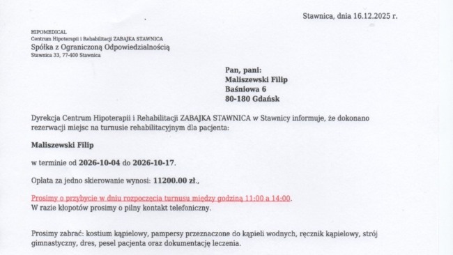 W poniedziałek rozpoczynamy turnus rehabilitacyjny w NovaMed Brodnica.