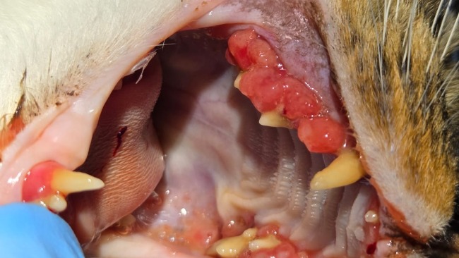 Dziś, gdy łapałyśmy ją do weterynarza kotka przewracała tyłem. Doktor zobaczył okropne narośla na dziąsłach.
