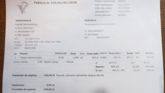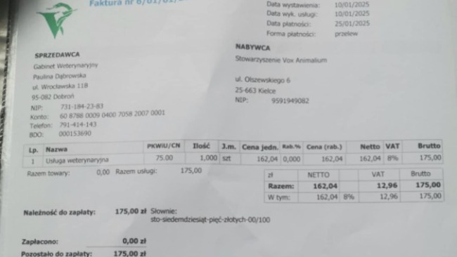 Piękna Gaja to duża sunia, która nie prosiła o wiele – tylko o miłość i ciepły kąt. Została zabrana ze schroniska w Krzeczkowie, miejsca, w którym każdy dzień wyglądał tak samo – samotność, smutek, zimno, strach. Jest dużym psem, a to często wyrok dla takich jak ona. Duże psy rzadko znajdują domy. Ludzie widzą w nich problem – za duże, za trudne, za wymagające. A przecież one same nie wybrały swoich rozmiarów…Gaja ma ogromne serce, które mimo wszystko wciąż bije dla ludzi. I potrzebuje naszej pomocy- ma odmrożone łapki i niezdiagnozowany jeszcze problemy z pęcherzem. Musimy zrobić badania, ato koszt, który przekracza nasze możliwości, ponieważ jesteśmy tylko niedużą grupką, która za hotelik placi z własnej kieszeni.Każda złotówka to dla niej szansa na lepsze jutro – na życie, w którym będzie miała coś, czego dotąd nie zaznała: troskę, czułość i czyjąś obecność.Czy wiesz, jak wiele psów takich jak Gaja odchodzi w samotności, nigdy nie poczuwszy ciepła ludzkiej ręki?Nie pozwólmy, aby Gaja była jedną z tych, które odchodzą w ciszy. Dziękujemy za każdy gest wsparcia. Razem możemy uratować jej świat.