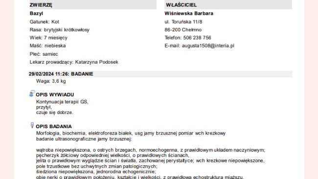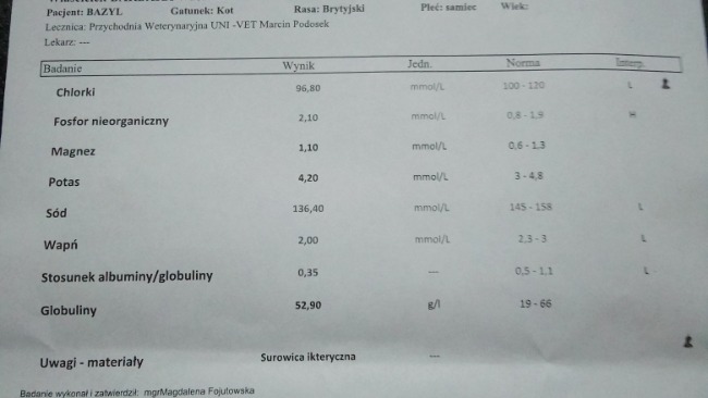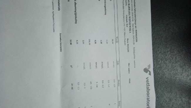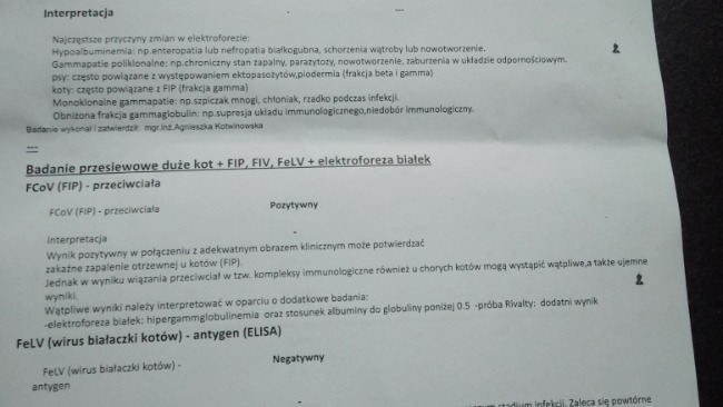Jestem emerytką,zbieram na leczenie mojego kota, który ma 7miesięcy i zachorował na zakaźne zapalenie otrzewnej. Lek który może pomóc jest bardzo drogi, ampułka na 4 i pół dawki kosztuje 350zł a leczenie trwa 84 dni . Do postu dołączam wyniki badań