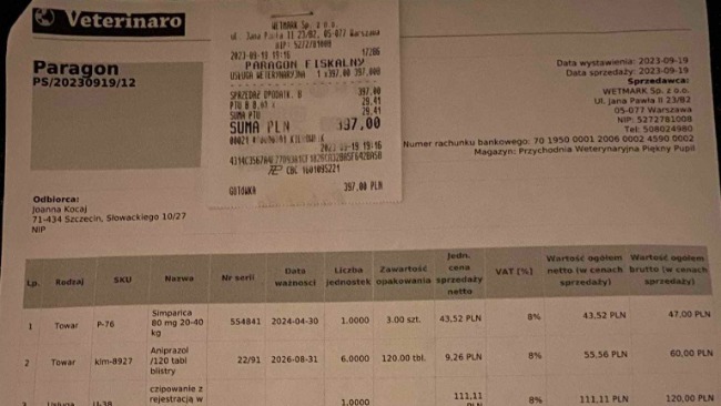 ( faktura poniżej dotyczy dwóch psiaków w tym Fajterka)