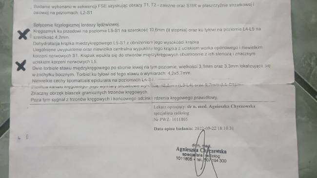 Choroba międzykrążkowa, uwypuklenie pierścienia, osteofity, rwa kulszowa , kręgozmyk przedni i tylni, znaczne zwyrodnienia, uszkodzenia korzeni rdzeniowych i co najgorsze stenoza kanału kręgowego