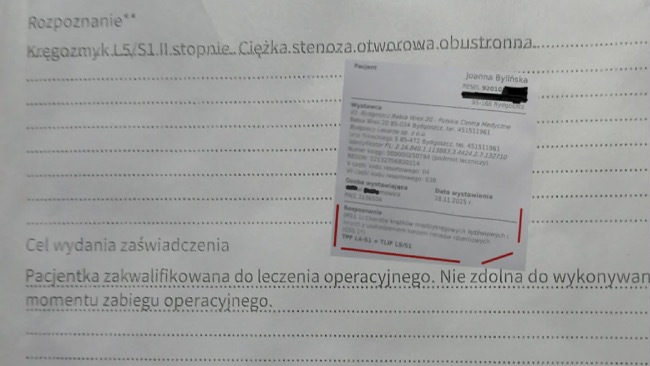 Podczas wizyty kontrolnej dnia 18.11 okazało się że stan kręgosłupa mojej siostry uległ pogorszeniu . Postawiono nowe rozpoznanie: ciężka stenoza otworowa obustronna kanału kręgowego, o wymiarach 4,5 mm oraz 7 mm . Ucisk na rdzen jest coraz silniejszy i coraz uporczywiej odbiera władzę w kończynach mojej siostrze.