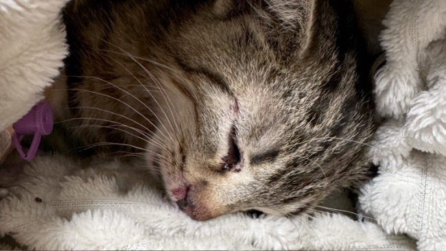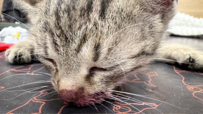 Maleństwo ma około 3/4 miesiące i uraz głowy. Wygląda na kota czystego, wychudzony raczej nie jest …. Zatem jaka jego historia? Co się stało ?