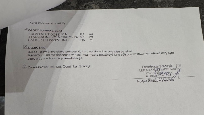 Stabilizacja cała noc. Od rana znowu klinika. Koncentrator tlenu mamy, leki do podawania o 24 w nocy i rano też mamy.