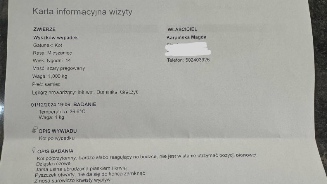 Pędziliśmy do lecznicy. W USG fast nie stwierdzono żadnych pękniętych narządów w jamie brzusznej. Tlen, kroplówka, leki dożylnie.