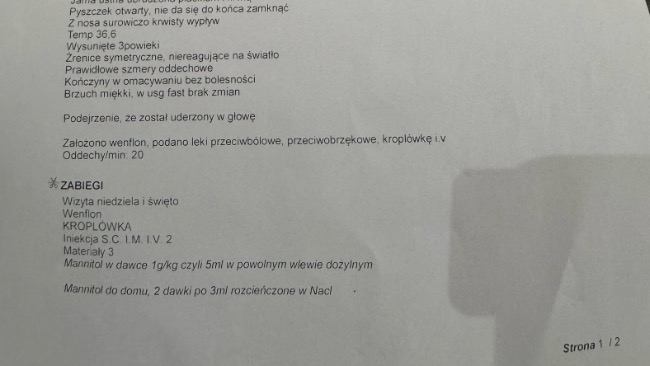Obrażania głowy wskazują na jakieś uderzenie/ upadek / kopnięcie 😓 Obrzęk mózgu, krwiaki zagałkowe, krew z nosa, trudności w oddychaniu z powodu obrzęku w nosie. Zalega krew.