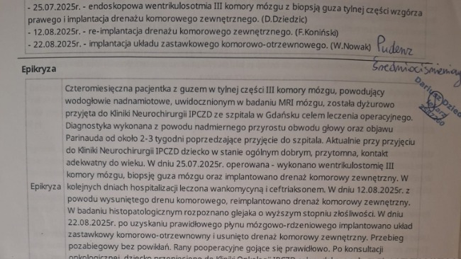 Żona zauważyła delikatne krwawienie podczas zmiany pieluszki. Nie lekceważąc żadnych objawów, szybko udaliśmy się do pediatry. Podejrzewano zapalenie układu moczowego. Nasza lekarka jednak zauważyła, że Amelka ma znacznie większą główkę w stosunku do reszty ciała. Zaleciła nam wykonanie dodatkowych badań.Badanie wykazało powiększone komory mózgowe. Pilnie udaliśmy się do kolejnego specjalisty. Wykonano badania. Padło podejrzenie guza mózgu. Udaliśmy się na następną konsultację, na której diagnoza została potwierdzona.