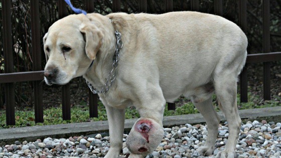 Lewa łapa Arona jest w złym stanie. Napuchnięta, z pękniętą skórą i wyciekającą ropą. Podobno 2-3 miesiące temu pies nadział się na zardzewiały drut kolczasty, rana byla duża, ale właściciele uznali, że zagoi się samo "jak to na psie".