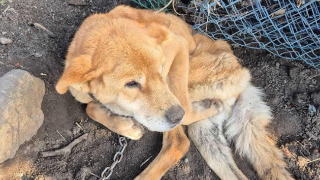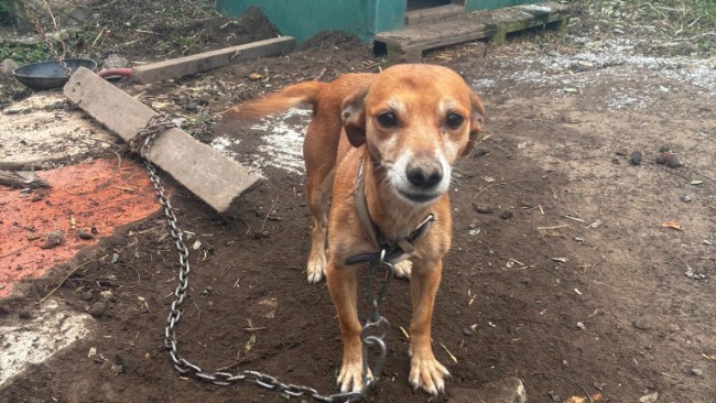 To pies przywiązany do łańcucha tak krótkiego, że nie może zrobić kroku..