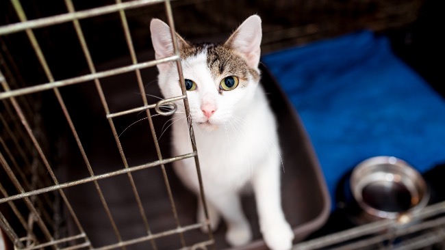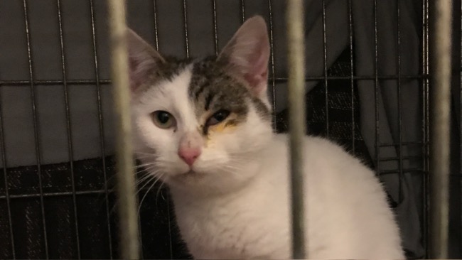 Tutaj jeden z kotków, które mają chore dziąsła kilka miesięcy temu, zaraz po odłowieniu ze stada, chory na koci katar: