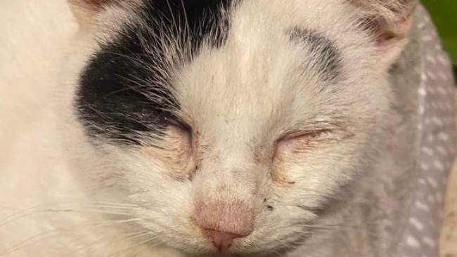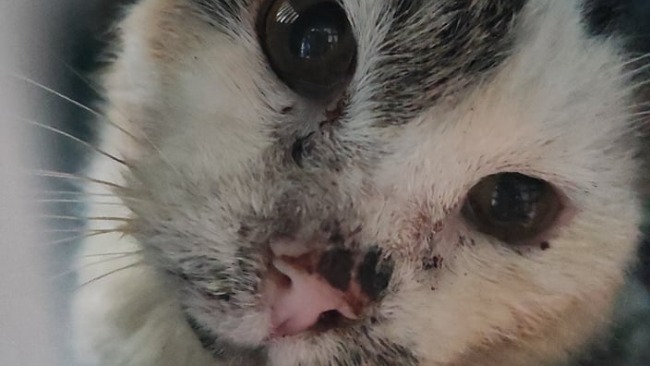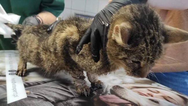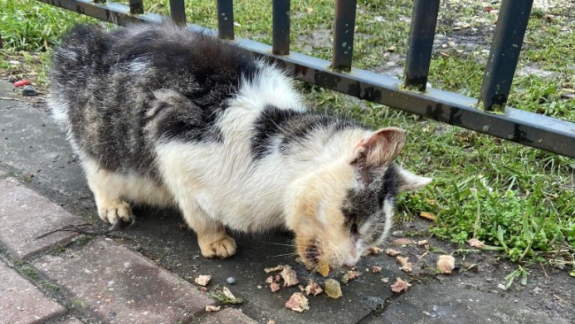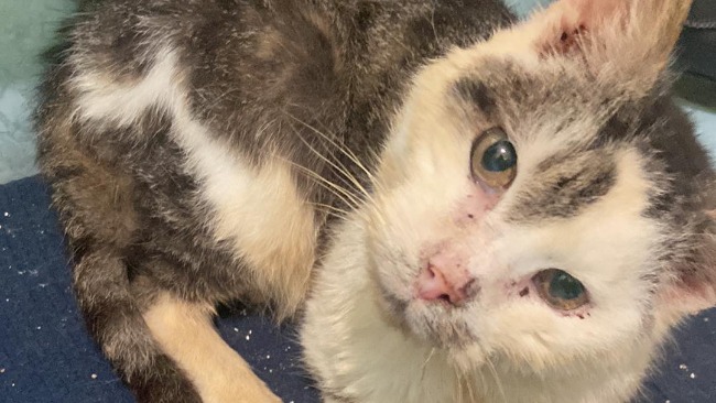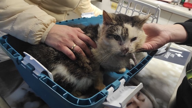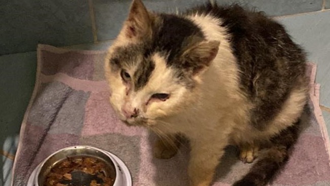 Kot "Dziadziu" w wieku około 9 lat. Niedożywiony, odwodniony. Rozpoznany koci katar, świerzb skórny i uszny. Zepsute zęby do wyrwania.