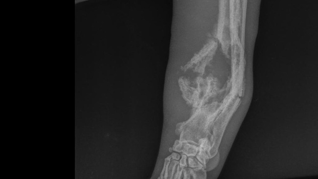 Zdjęcia RTG po przyjeździe Babsi do nas skonsultowaliśmy z 3 ortopedami. Niestety wszyscy są zgodni co do tego, że łapa wygląda źle i być może możemy mieć do czynienia z agresywnym nowotworem kości.