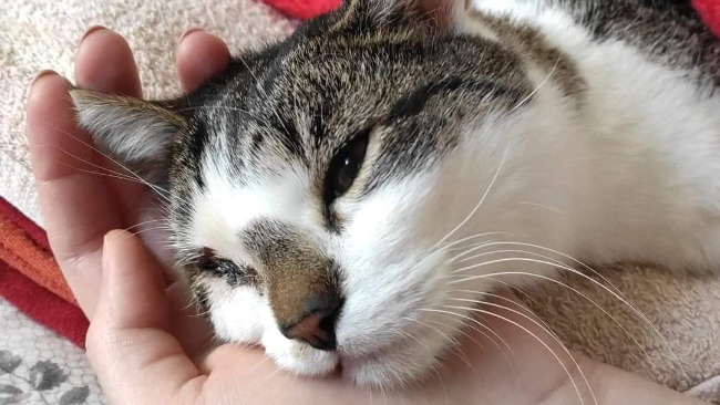 Nie moja, bezdomna, mieszka na wsi i jest dokarmiana przez pewnego pana. Dostała zapewne w główkę, bo z widocznych uszkodzeń miała tylko ranę na oku i przy ustach (które już się goją). Leżała jednak nieruchomo. Została zabrana do weterynarza, który na początku od razu sugerował uśpienie, jednak ruszała trochę głową i nie była połamana, więc dał jej szanse. Powoli troszeczkę jej się polepszało, jednak nadal dalej tylko leży. Czasami się przeciąga i wyciąga wtedy łapki, ale na tym koniec. Przy ściśnięciu łapek, zabiera je. Nie jest w stanie jednak ani stać, ani siedzieć. Głowę podnosi trochę, ale jedynie leżąc na lewym boku. Położona w pozycji "na chlebek" przekręca głowę w prawą stronę (ale nie jest w stanie sama jej utrzymać w górze). Poza tym tylko leży.