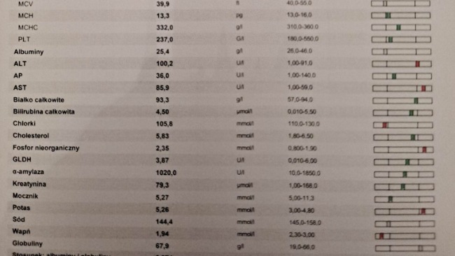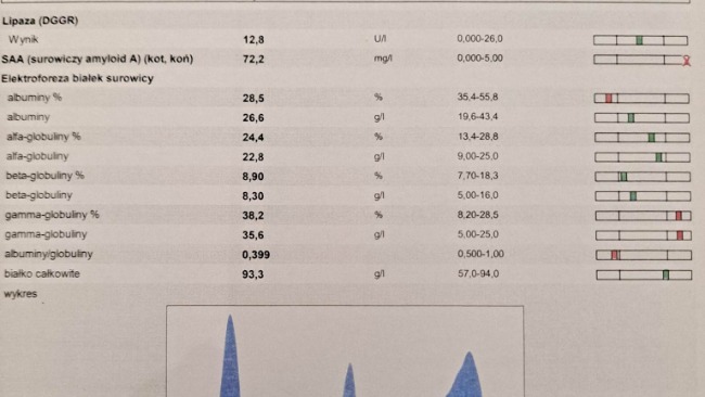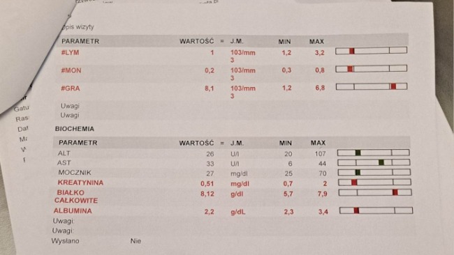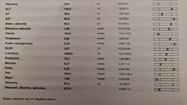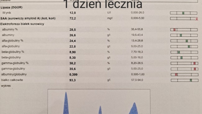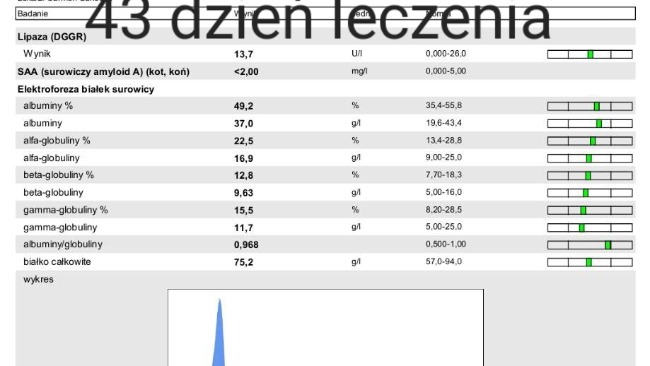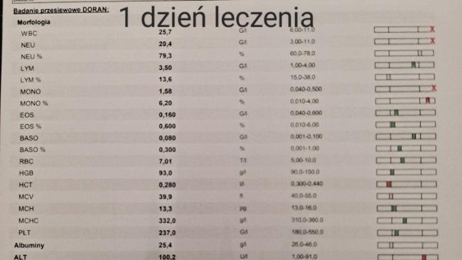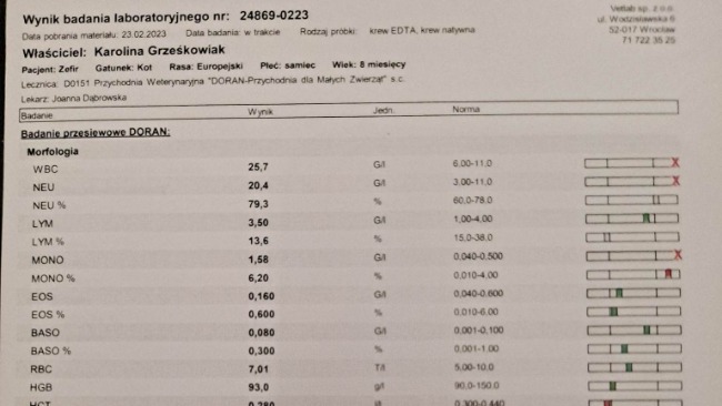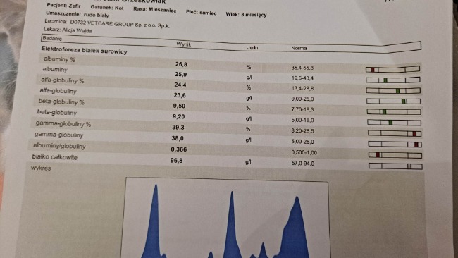 Edit: Serdecznie dziękujemy wszystkim za pomoc!!! Jesteśmy bezmiernie wdzięczni! Zefirek czuje się dużo lepiej :)Wrócił mu apetyt, w niecały mięsac przybrał na wadze ponad kilo, i jest chętny do zabawy jak nigdy :) Wyniki ostatnich badań są naprawde zadowalające:) Dla porownania poniżej zamieszczam wyniki z 1 dnia leczenia i te obecne (dziś mamy 52 dzień leczenia)