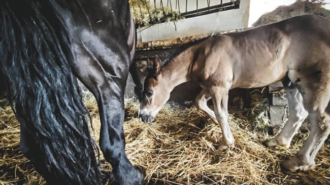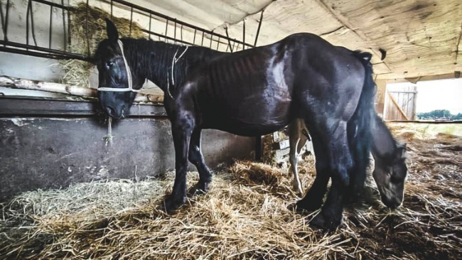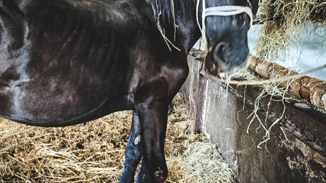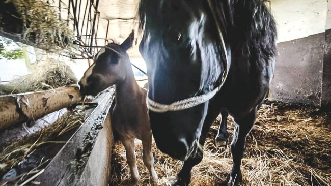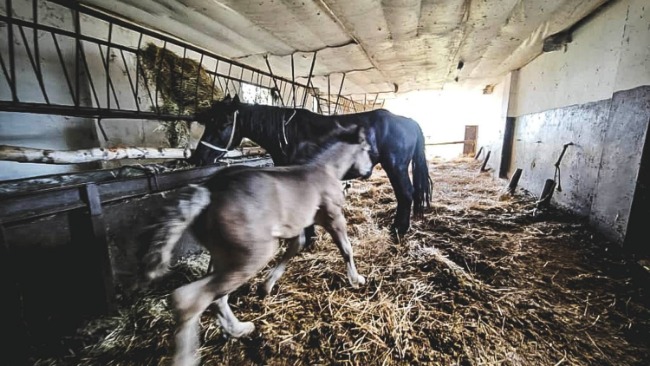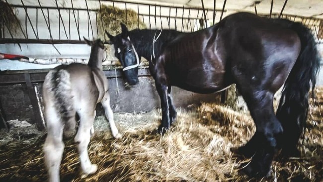 Karina jest koniem chorym, bardzo chorym. Staw nadgarstkowy w przedniej nodze jest bardzo powiększony, jest tam też rana. Klacz bardzo silnie kuleje. Przed nią diagnostyka i leczenie. Maluszek jest zdrowy, ale bardzo wystraszony. Oboje teraz muszą się przekonać, że nie wszyscy ludzie są źli. Że ręka nie bije, a daje marchewki i głaszcze.
