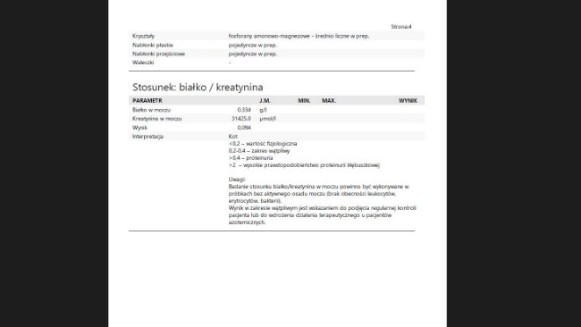 – podwyższony ciężar właściwy (zagęszczony mocz), białko w moczu