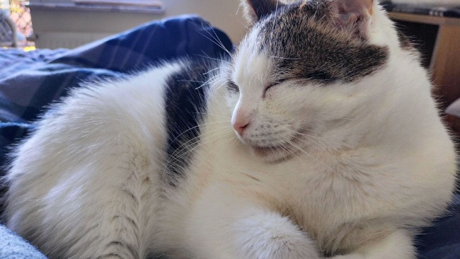 "Wojtuś jest bardzo cichym i wycofanym kotem. Ma swoje ulubione legowisko w mojej sypialni , które naprawdę rzadko opuszcza. No chyba, że przenosi się na moje nogi. Bo wystarczy, że się położę, to od razu przechodzi na łóżko. I zawsze śpi na moich nogach lub brzuchu. Przez całą noc. Nawet nie przeszkadza mu, że ja co chwilę zmieniam pozycje. Z powodu bólu kręgosłupa nie jestem w stanie wytrzymać w jednej pozycji dłużej niż pół godziny. Wojtuś po prostu czeka, aż zmienię bok i znowu się na mnie kładzie. Od samego początku jest bardzo zżyty z Lakusiem. Często kładzie się obok niego. A reszty kotów prawie nie zauważa…