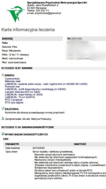 U Yoko stwierdzono też lekką niedomykalność zastawki, więc była traktowana specjalnie, jako pacjentka kardiologiczna. Po zabiegu przeszła trudne chwile, bo jest bardzo przywiązana do Pani Elżbiety.