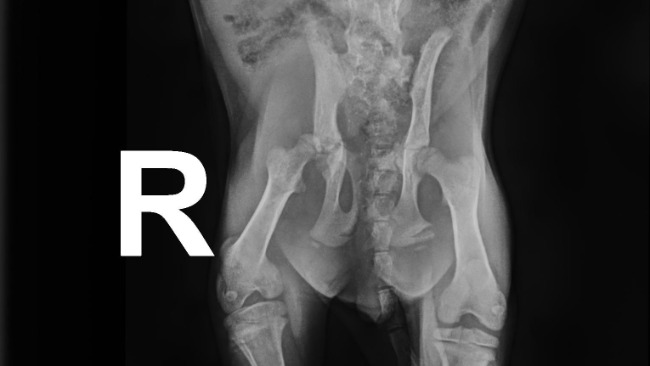 Isię potrącił samochód na kilka dni przed tym, gdy została złapana i przeniesiona z szopy pod Skierniewicami do domu tymczasowego. Prawa kość udowa kotki wypadła ze stawu biodrowego, teraz znajduje się w niewłaściwym miejscu i jak to widać na zdjęciu RTG zahacza o miednicę.