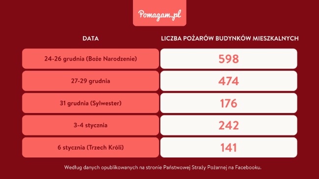 Z danych podanych przez Państwową Straż Pożarną można wyliczyć, że w okresie świąteczno-noworocznym codziennie płonęło średnio ponad 160 budynków mieszkalnych. Tylko w święta Bożego Narodzenia spłonęło ich prawie 600. W zaledwie dwa tygodnie ogień odebrał dorobek życia setkom rodzin. Bilans ten obejmuje niestety również ofiary śmiertelne i dziesiątki osób rannych.