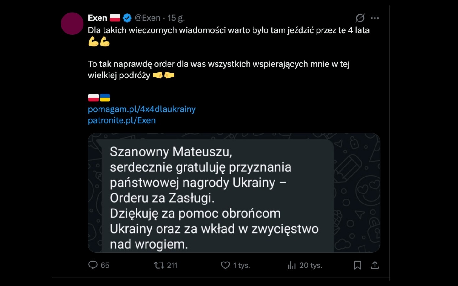 Wokół czwartej rocznicy wybuchu wojny w Ukrainie, Prezydent Wołodymyr Zełenski podpisał dekret o nadaniu odznaczeń państwowych dla osób szczególnie zasłużonych we wspieraniu obronności i suwerenności kraju (Dekret nr 134/2026). Wśród uhonorowanych znalazł się Mateusz Wodziński, znany szerzej jako Exen, za akcję „Terenówki na front”. Prezydent Ukrainy nadał mu “Order Za Zasługi” III stopnia.