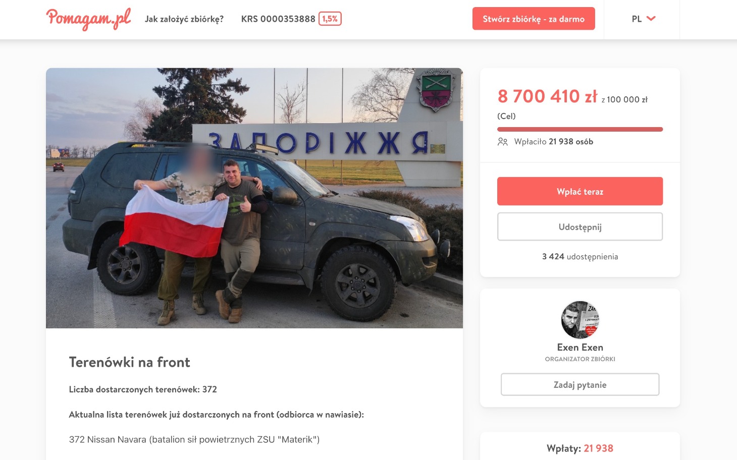 To, co zaczęło się od chęci przekazania swojej Suzuki Grand Vitary, przerodziło się w jedną z najbardziej rozpoznawalnych inicjatyw pomocowych tej wojny. Exen przez ostatnie cztery lata zebrał ponad 8,7 mln złotych w ramach zbiórki crowdfundingowej na Pomagam.pl, którą wsparło 22 tys. osób. Do tej pory przekazał już 372 samochody w ramach 150 misji w Ukrainie. Wszystkie samochody osobiście kupuje i dostarcza, a na stronie zbiórki oraz X zdaje relacje z każdego wyjazdu.