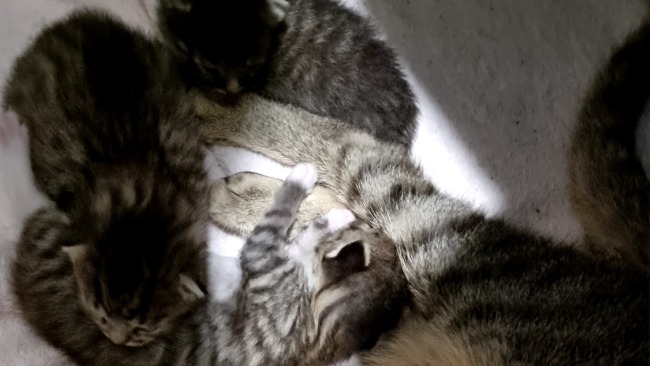 9 lipca, pamiętam to była niedziela, zapukały do mnie dzieci i powiedziały że na trzecim piętrze znalazły tego kotka pod drzwiami. A że okazał się bardzo przytulaśnym i mruczącym kotkiem ,szukały dla niego pomocy. Kotek okazał się drobniutką młodą koteczką i na dodatek z wysoką ciążą. Zdawałam sobie sprawę że u mnie ,gdzie jest 18 kotów, nie mam gdzie jej umieścić ,ale wypuścić też nie miałam serca. Pomyślałam sobie że przetrzymam ją przez noc a jutro zawiozę ją do schroniska. Kotka była bardzo głodna i spragniona,w mgnieniu oka pochłonęła dwie saszetki karmy i miseczkę wody. Wiedziałam że na mojej ulicy ktoś poszukiwał burej kotki, więc myślę sobie, zrobię ogłoszenie ,może znajdzie się właściciel. Poszłam zrobić jej zdjęcie i chcąc wyjąć ją z kojca natrafiłam na coś mokrego , a to był nowo narodzony kociaczek.