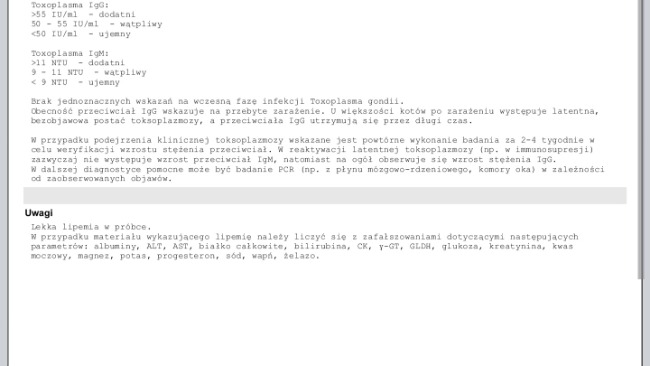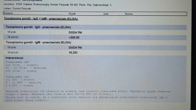 Od razu zastrzyki, kroplówki i po mału zaczęła reagować. Zrobiliśmy badania,USG ,oraz zalecany przez lekarza test na toxoplazmozę,codzienne wizyty kroplówki i antybiotyk postawiły ją trochę na nogi. Czekaliśmy na wynik testu który, niestety okazał się dodatni.
