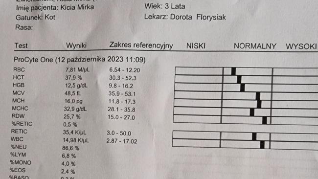 Pozostałe wyniki nie były najgorsze . Kotka zaczęła dostawać Zodon. Cieszyłam się że temperatura już jej przestała dokuczać. Moja radość nie trwała długo ,po dwóch dniach ponownie wróciła temperatura ponad 40⁰,kotka nie jadła, była słaba więc ponownie lekarz i badania pod innym już kontem.