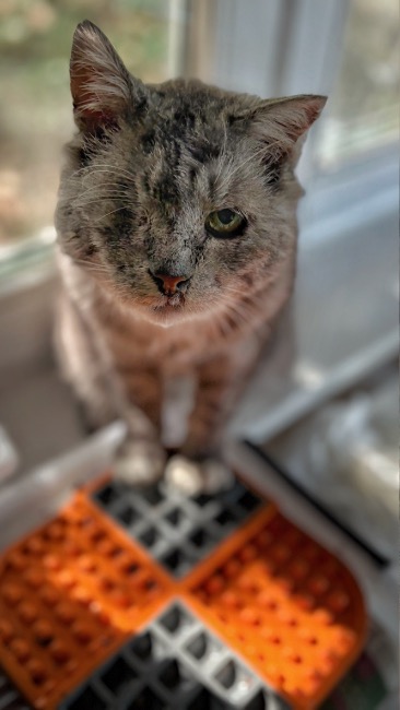 Kotek jest bardzo dzielny i jako już dziadek korzysta z życia, bo dopiero teraz po wszystkich przejściach czuje się dobrze.