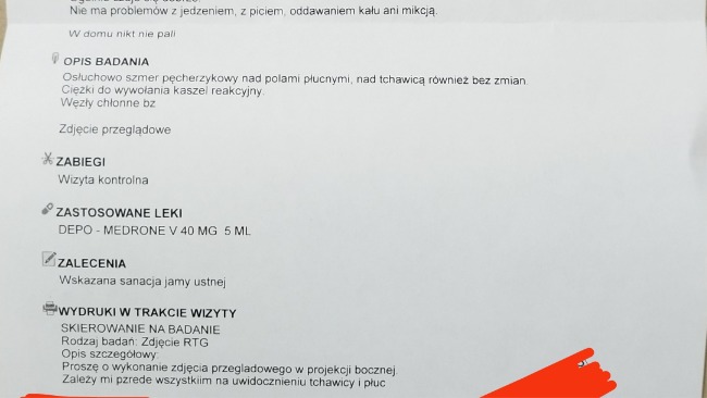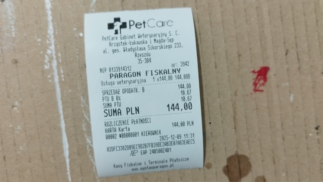 Na ten moment, za konsultacje lekarskie oraz leki zapłaciłam 144 zł. Paragon i karta leczenia w zakłaczeniu.