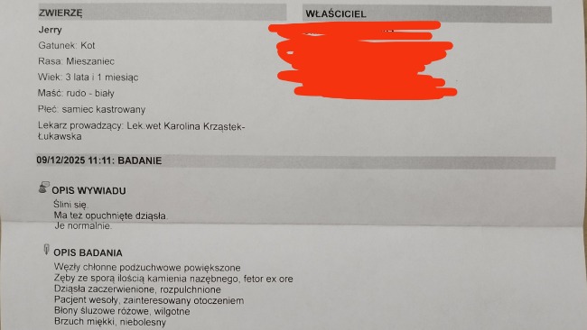 Jerry i Brownie są młodymi 3 letnimi kotami, dlatego też dość zaskakujacą i nagłą, okazała się informacja o konieczności wykonania u jednego i drugiego kota, zabiegu stomatologicznego. Sprawa jest o tyle pilna, że stan zapalny i dyskomfort dyktują ową konieczność. Dziąsła Jerrego są rozpulchnione i zaczerwienione, a węzły chłonne podżuchwowe powiększone. Dodatkowo bardzo nieprzyjemny zapach z pyszczka nie pozostawia złudzeń. Natomiast Brownie, ma napady kaszlu, podczas gdy zdjęcie RTG nie wykazuje niepokojących zmian. Przy tej okazji Lekarz oceniła od razu, że konieczne jest wykonanie sanacji jamy ustnej, gdyż wszystko ma znaczenie w postępowaniu diagnostycznym.