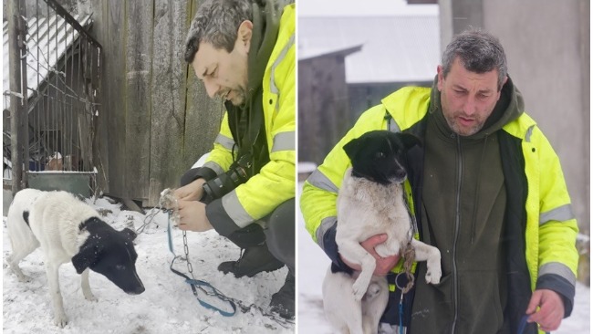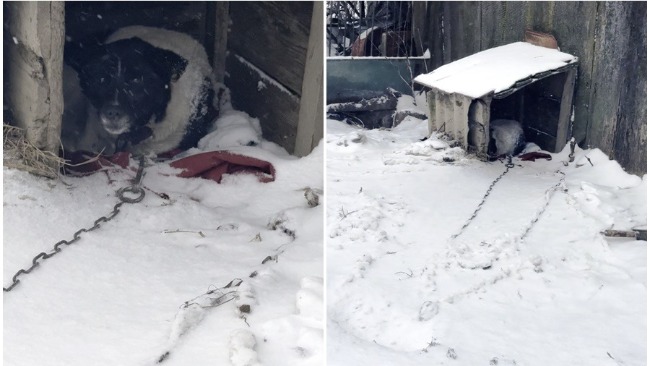 W budzie leżały tylko dwie stare bluzy – przemoczone, przemarznięte, bezużyteczne przy takich temperaturach. To nie dawało żadnej ochrony. Pies trząsł się z zimna, zapchlony, wychudzony, skrajnie zaniedbany.
