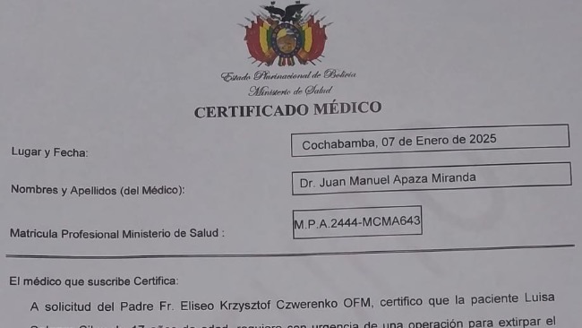 Jako misjonarz franciszkański w Boliwii spotykam wiele osób potrzebujących pomocy, ale historia Luisy szczególnie poruszyła moje serce. Niedawno przeprowadziliśmy pierwszą zbiórkę na badania diagnostyczne - dzięki wielkiej dobroci darczyńców udało się zebrać potrzebną kwotę w zaledwie 3 dni! Teraz, gdy znamy diagnozę, musimy działać jeszcze szybciej.