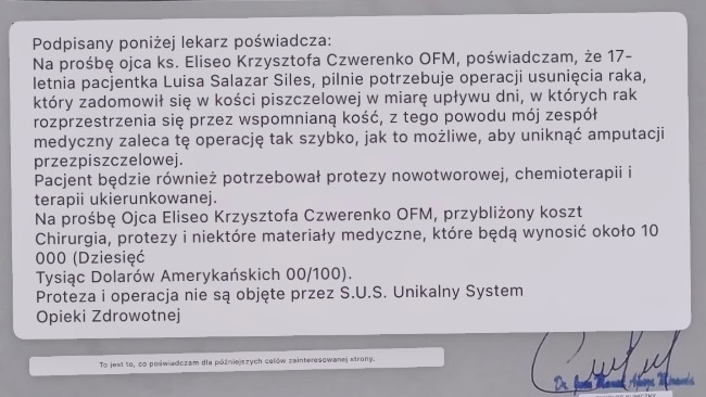 Każda wpłata to szansa na uratowanie nogi młodej dziewczyny i powstrzymanie rozwoju nowotworu. Będę niezmiernie wdzięczny za każdą formę wsparcia - czy to finansową, czy przez udostępnienie tej zbiórki. Claudia i Luisa modlą się za wszystkich darczyńców, a ja zapewniam o pamięci w codziennej Mszy Świętej.