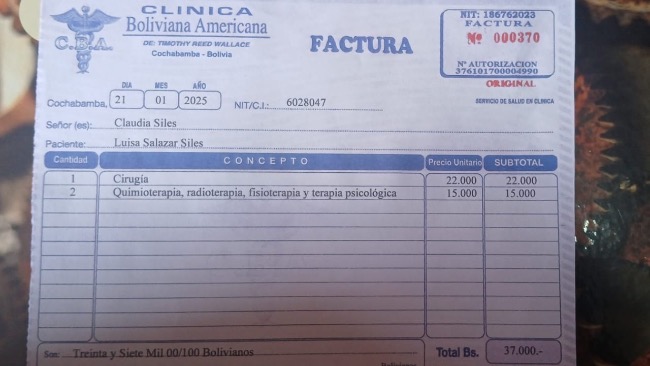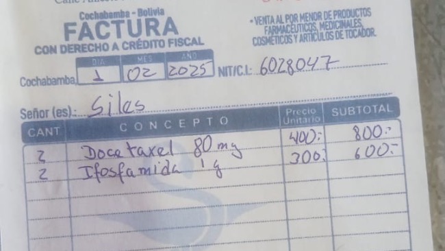 Jednak to nie koniec naszej walki. Lekarz zalecił 6 sesji chemioterapii, które są niezbędne w procesie leczenia. Każda sesja kosztuje 3000 boliwianos (około 500 USD). To kolejne wyzwanie, ale wierzę, że z Waszą pomocą i tym razem damy radę!